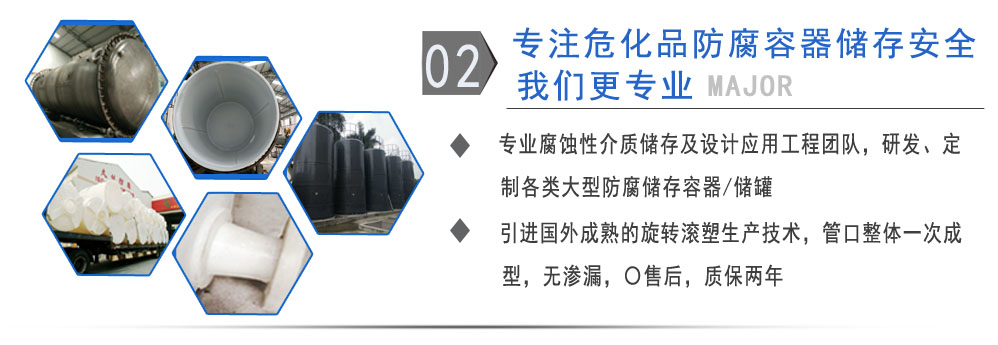 公司有鋼襯塑PE/PO、PE全塑、碳鋼、不銹鋼四大系列100多個品種,專注于常壓儲存容器生產,其產品包括鋼襯塑儲罐、管口一體成型PE儲罐碳鋼儲罐、不銹鋼儲罐、反應釜、攪拌罐、離子交換柱、鋼襯PE/PO儲罐塑料儲罐、鹽酸儲罐硫酸儲罐等等。更大限度滿足廣大客戶的各種需求,同時可以根據客戶的需要加工定制各種防腐設備。